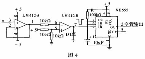 為了排除以上干擾,設計了一個檢測電路(見圖4)。整個檢測電路由跟隨器、比較器、定時器組成。跟隨器的作用是將檢測電路與儀表的其他電路隔離,防止檢測電路對信號u產生影響。比較器電路的正向輸入端接2.5V的電壓,當傳感器管路不是空管時,由于信號u,ZUI大值不超過0.5V,所以比較器的輸出始終為高電平;當傳感器管路為空管時,比較器輸出一序列的方波信號。二極管D1為方波信號的負電壓提供回路。由NE555構成的通用定時器電路的工作原理是:當輸入觸發信號電平低于電源電壓的1/3時,內部比較器開始工作,觸發電路觸發,內部的放電晶體管斷開,電容C被充電。充電電壓超過電源電壓的2/3時,內部比較器再次工作,放電晶體管把電容C中積蓄的電荷放掉,然后等待下次觸發,輸出脈沖寬度由T=1.1×C×R確定,脈沖寬度ZUI長可達數十秒。