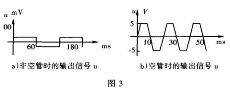 當傳感器不是空管時,由于比較器電路始終輸出高電平,不能觸發定時器工作,定時器輸出為低電平。而傳感器為空管時,比較器的輸出脈沖不斷地觸發定時器,若T大于20ms時,定時器的輸出信號始終為高電平。因此,單片機只要通過檢測定時器的輸出信號,便可知道是否為空管。