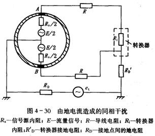 一是由于激磁繞組和電極之間的靜電感應引起的同相干擾,如圖4-29所示,在激磁繞組和電極A, B之間存在絕緣電阻RM和分布電容Cf,激磁電壓通過RM和Cf及兩電極之間的內阻,對地產生同相的干擾電勢et。
